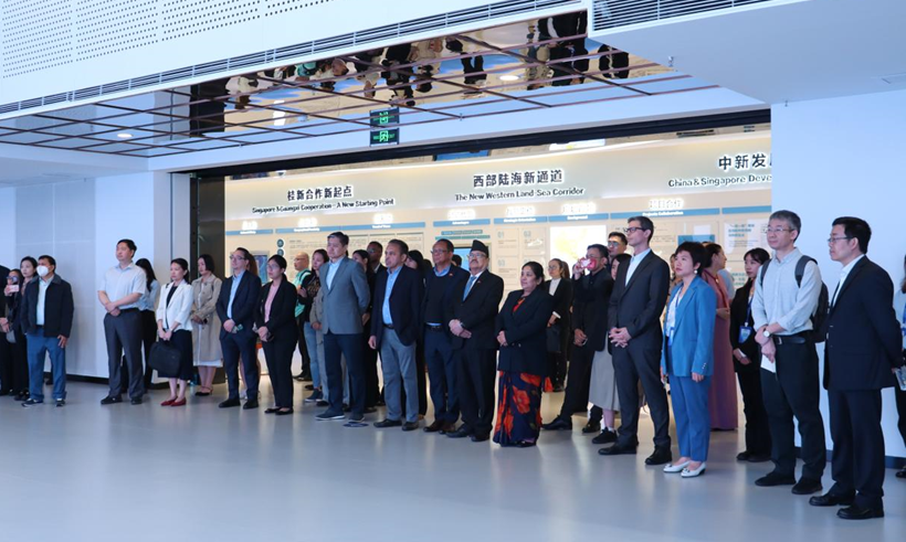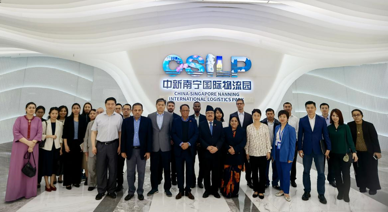 在中新物流園,使節團通過(guò)參觀(guān)展廳、聽(tīng)取介紹、互動(dòng)交流等方式詳細了解園區的發(fā)展情況,對西部陸海新通道的戰略地位與廣西在其中的作用有了更深的認識。中新物流園是廣西參與“一帶一路”及推進(jìn)中國與新加坡互聯(lián)互通、西部陸海新通道建設、海洋經(jīng)濟發(fā)展的重大項目之一,自2018年10月開(kāi)工建設以來(lái),園區發(fā)展迅猛,產(chǎn)業(yè)集聚效應加速顯現,現已引進(jìn)超30家世界500強和中國100強龍頭企業(yè)進(jìn)行合作,共同實(shí)施項目建設與運營(yíng)。