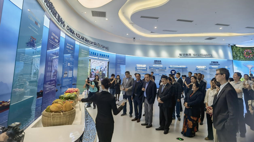 聚焦西部陸海新通道建設,共享發(fā)展新機遇!4月4日,位于中國(廣西)自由貿易試驗區的中新南寧國際物流園(以下簡(jiǎn)稱(chēng)中新物流園)迎來(lái)了由外交部主辦“駐華使節廣西行”的外國駐華使節團,來(lái)自東盟、南亞、中亞、拉美17個(gè)國家30多名外交官員在外交部外管司司長(cháng)陳立一行的陪同下實(shí)地參訪(fǎng)中新物流園,中國—東盟特色商品匯聚中心副總經(jīng)理盧春梅等熱情接待。