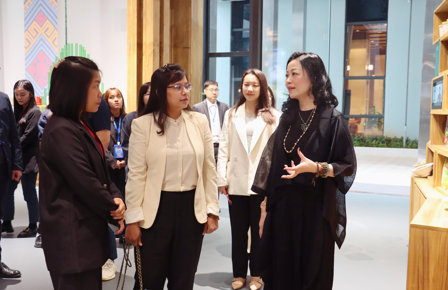在參觀(guān)匯聚中心17個(gè)國家及地方特色展館過(guò)程中,趙海燕董事長(cháng)介紹了匯聚中心展館如何通過(guò)人文設計理念烘托出各國當地特色產(chǎn)品,以沉浸式的獨特商品貿易體驗促進(jìn)交易。作為匯聚中心精心打造的國家主題展館,緬甸館以該國傳統特色文化為基調,巧妙融合本地風(fēng)土人情元素打造的“金色緬甸”效果,贏(yíng)得了高凱玨參贊的認可。她表示緬甸館不僅設計別出心裁,而且能夠在一定的空間里盡可能地將緬甸多元文化與特色產(chǎn)品展示出來(lái),可見(jiàn)項目策劃人所費的心思不一般。