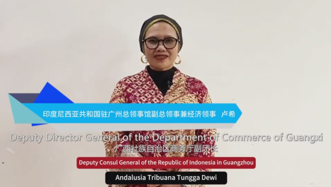 ▲盧希副總領(lǐng)事在視頻致辭中表示,包括廣西在內的華南地區在促進(jìn)印尼與中國建立更緊密、更深層次關(guān)系方面發(fā)揮著(zhù)關(guān)鍵作用。清真市場(chǎng)為印尼與廣西之間的合作,包括在東盟框架內的合作提供了巨大的機會(huì )。今年是印尼和中國建交75周年,中印尼兩國政府致力于進(jìn)一步加強伙伴關(guān)系。為此,她希望這次活動(dòng)能夠取得更加具體的成果,造福兩國人民。