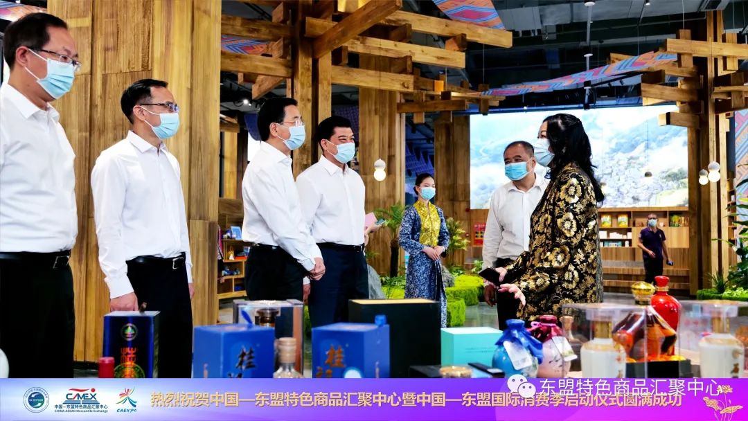 啟動(dòng)儀式結束后,張曉欽等自治區及南寧市領(lǐng)導、東盟各總領(lǐng)事、企業(yè)代表等一同參觀(guān)了中國—東盟特色商品匯聚中心展館,對匯聚中心的創(chuàng )新理念給予充分地肯定。在設計藝術(shù)上,展館不僅突顯各個(gè)東盟國家獨具匠心的人文風(fēng)情和建筑風(fēng)格;在商品展示中,還陳列了各式各樣別具特色的RCEP國家特色商品,如廣西的網(wǎng)紅“螺螄粉”;東盟國家的咖啡、燕窩、芒果干等產(chǎn)品;巴基斯坦的工藝品;健康養生的清真食品等,讓人賞心悅目,味覺(jué)大開(kāi),給來(lái)賓帶來(lái)沉浸式的貿易體驗,觸動(dòng)了現場(chǎng)嘉賓消費的熱情,更讓現場(chǎng)參觀(guān)的商家贊不絕口,對入駐匯聚中心表示極大的熱情。